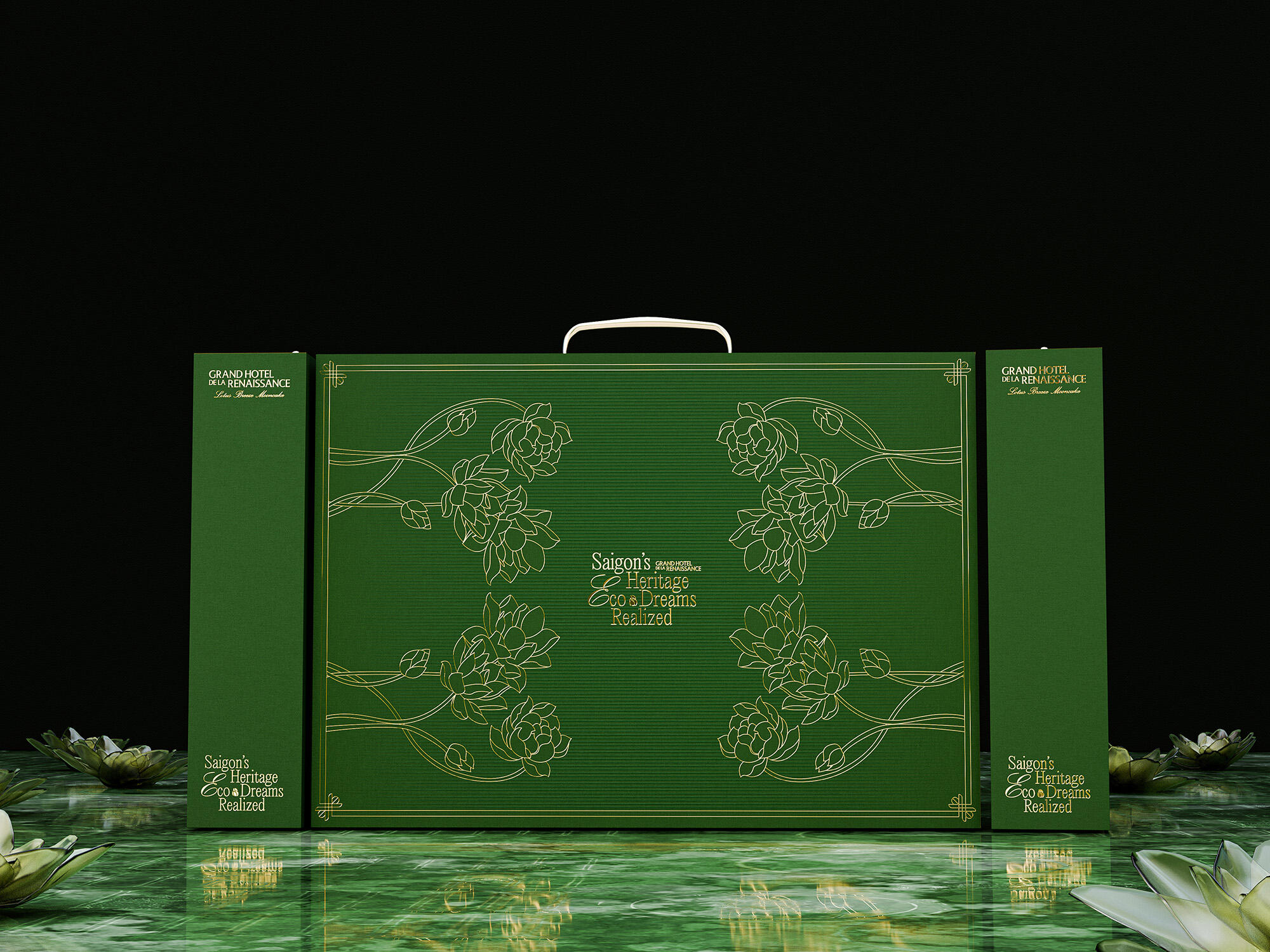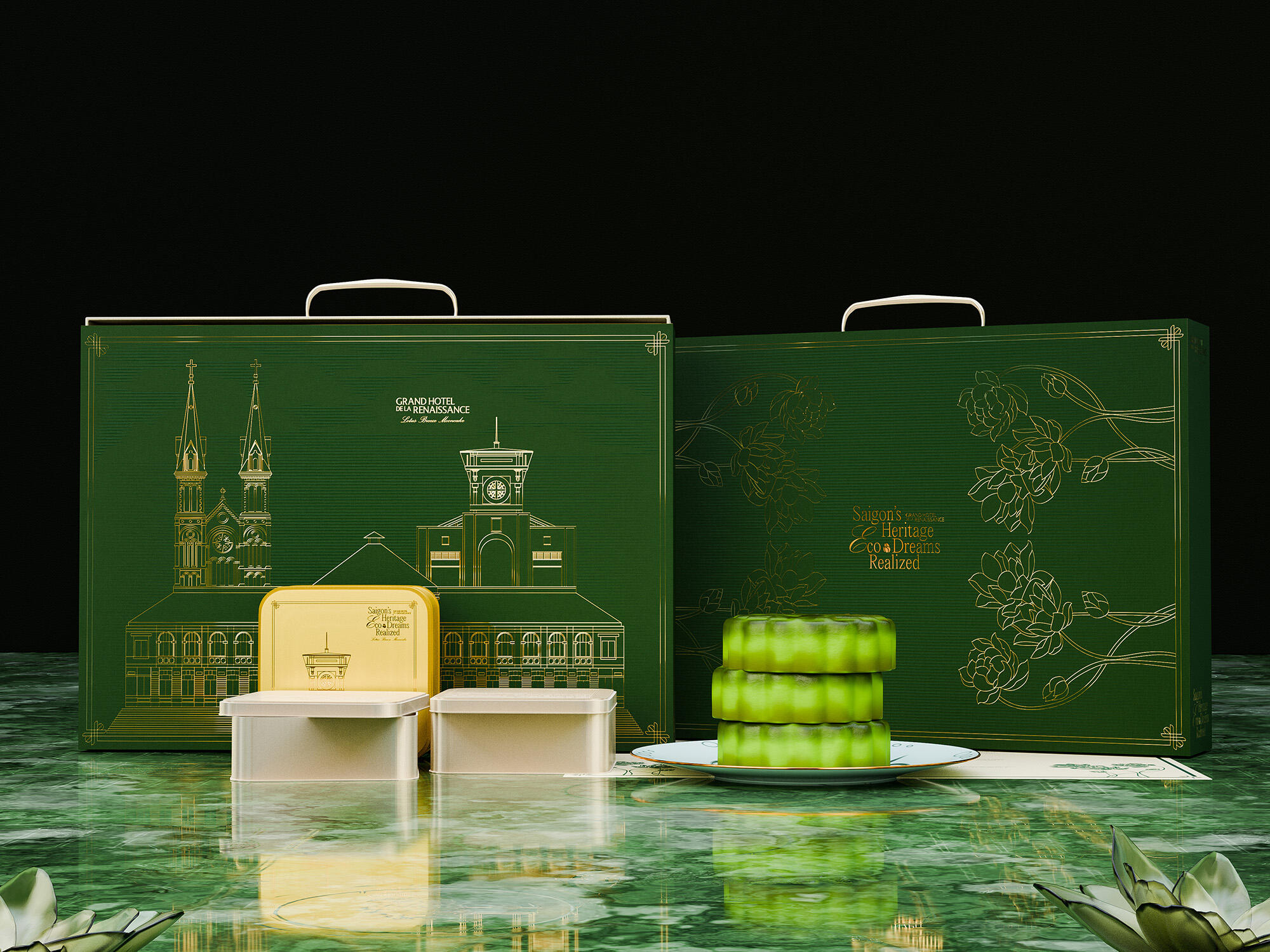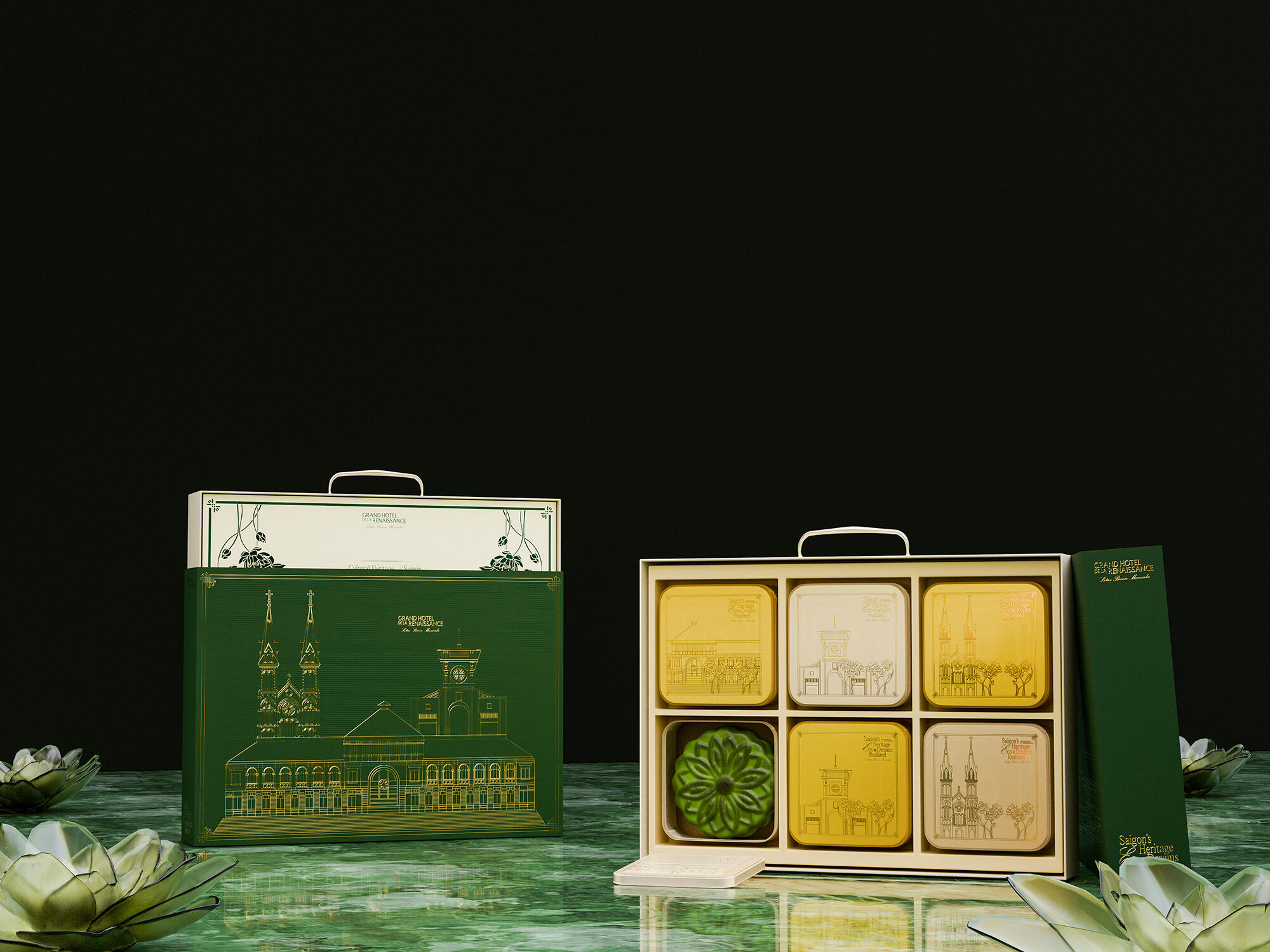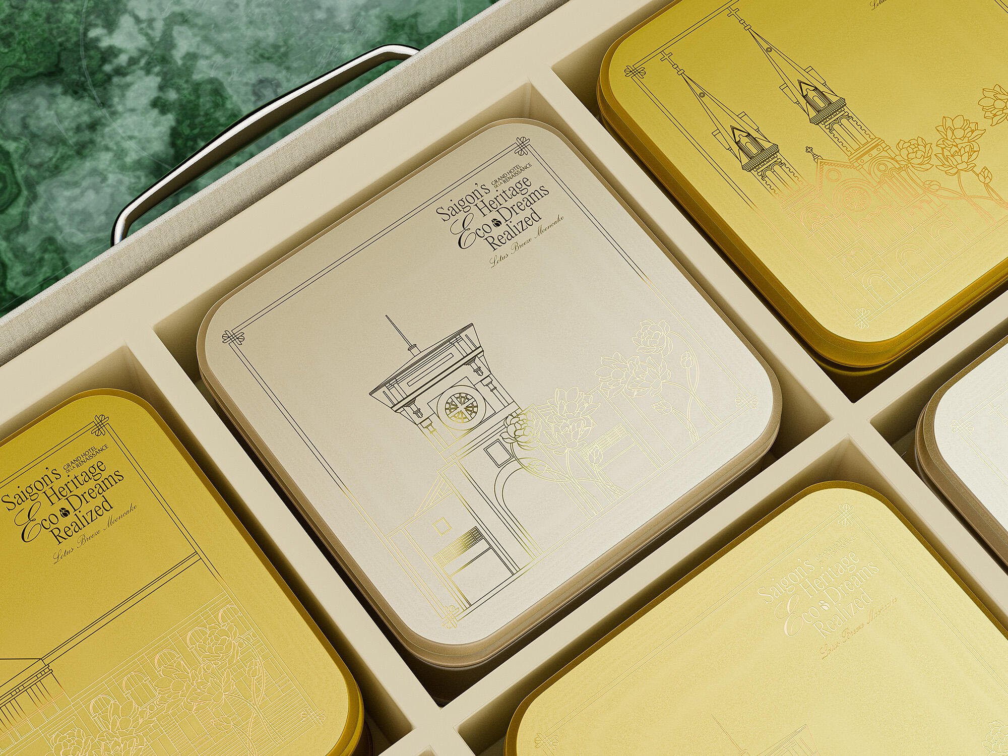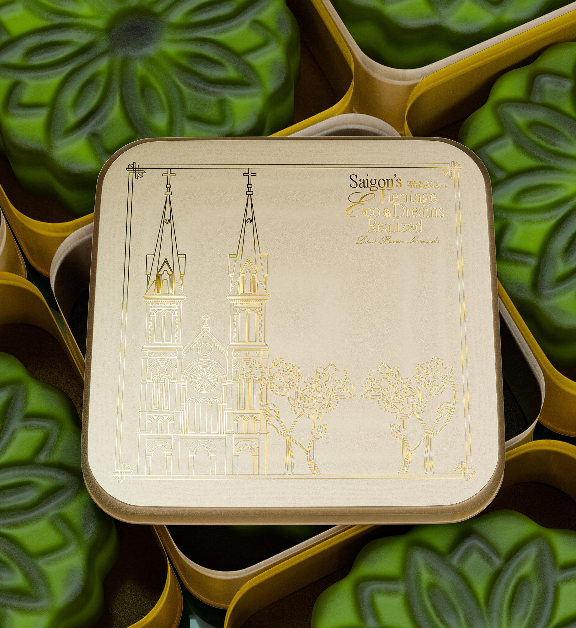 The "Lotus Breeze Mooncake" box from Grand Hotel de la Renaissance captures Saigon’s heritage and Indochine charm. Inspired by the golden era of Indochine, it blends classic French aesthetics with Vietnamese symbols. Featuring a lotus centerpiece that symbolizes purity, the packaging represents a fusion of tradition, artistry, and eco-friendly values, enriching each guest's experience of Saigon’s unique legacy.