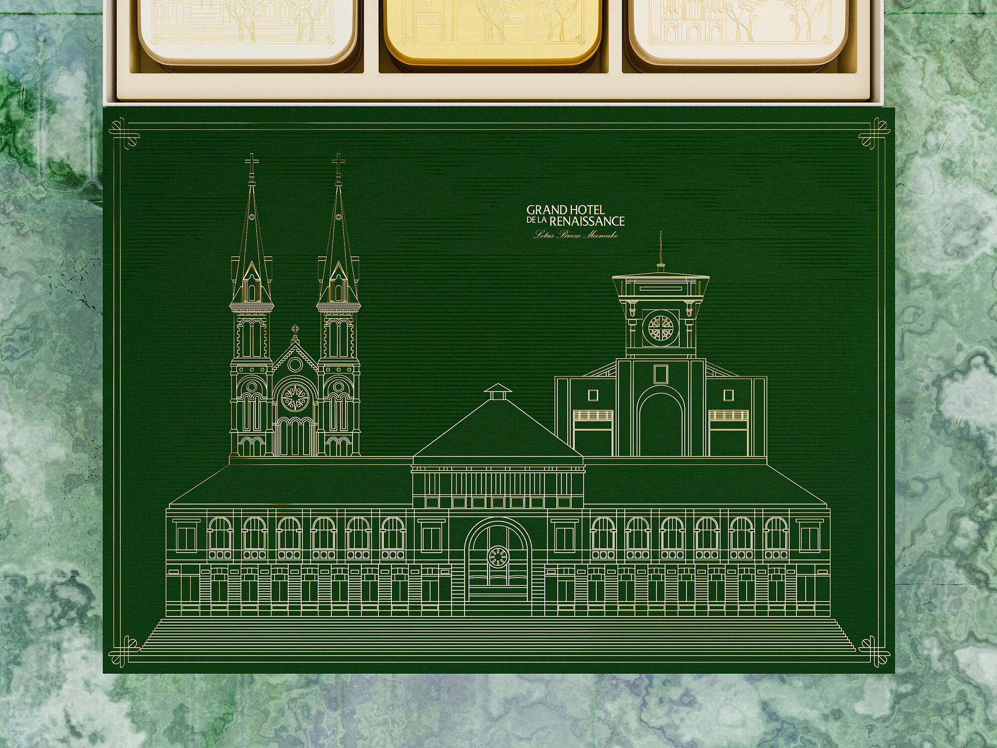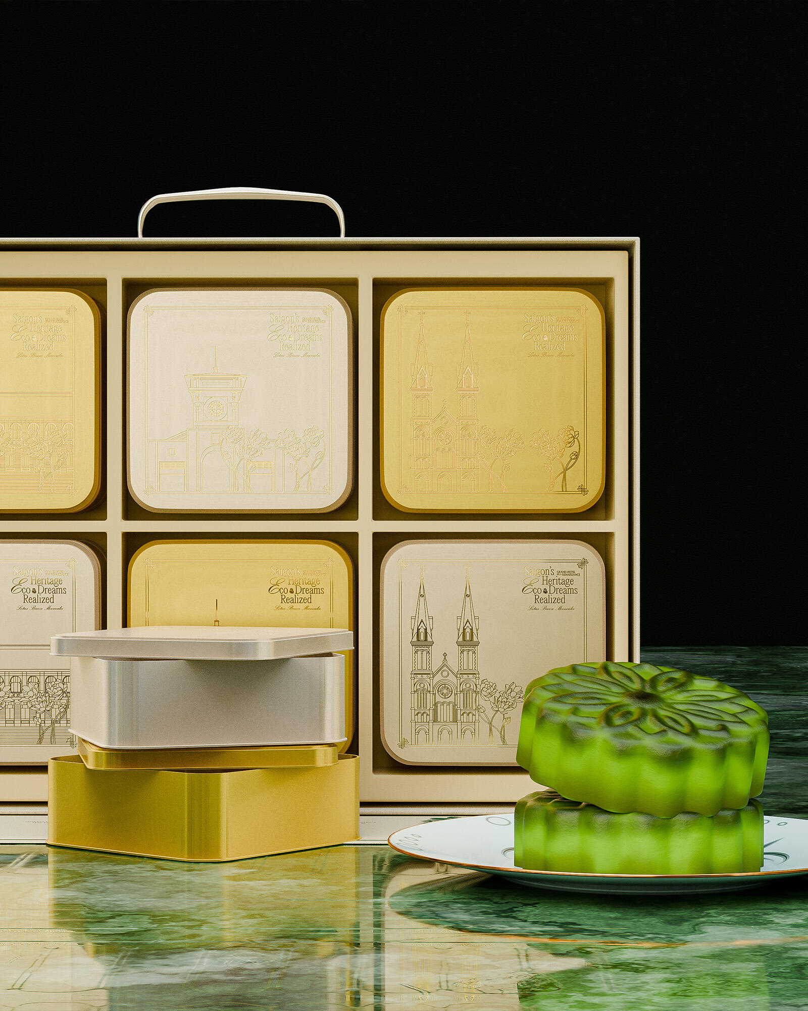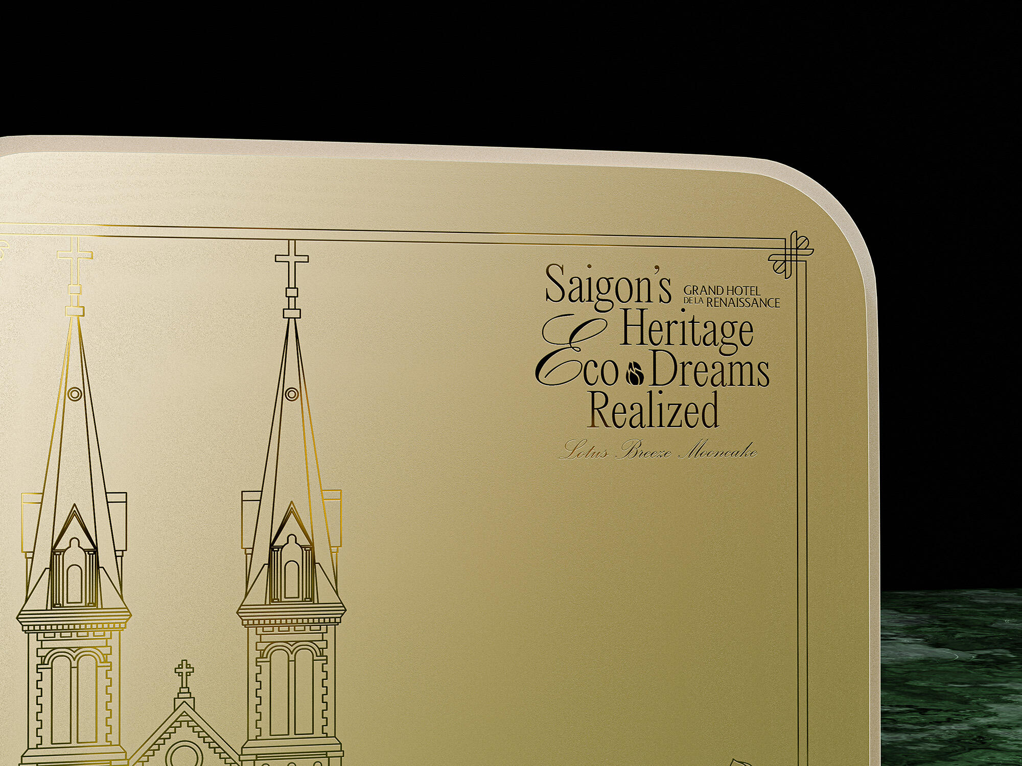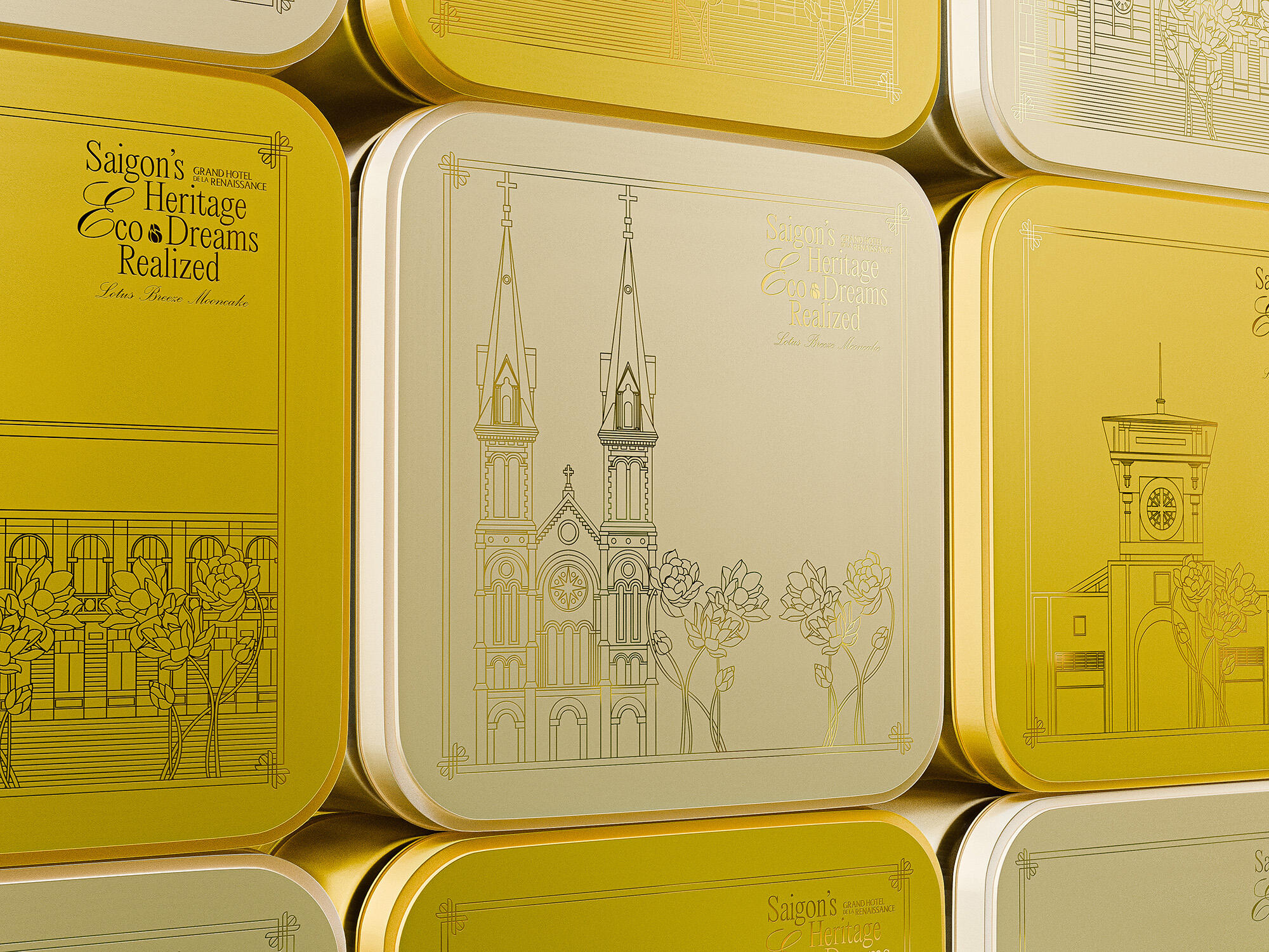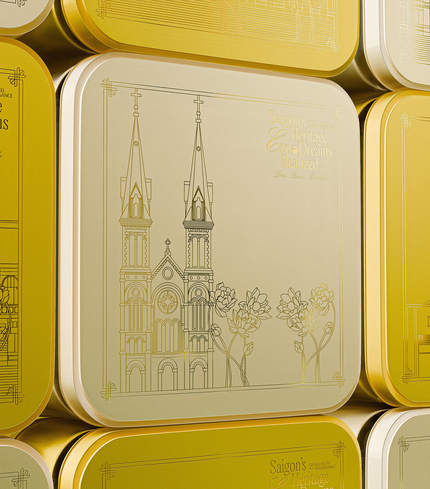 The "Lotus Breeze Mooncake" box from Grand Hotel de la Renaissance captures Saigon’s heritage and Indochine charm. Inspired by the golden era of Indochine, it blends classic French aesthetics with Vietnamese symbols. Featuring a lotus centerpiece that symbolizes purity, the packaging represents a fusion of tradition, artistry, and eco-friendly values, enriching each guest's experience of Saigon’s unique legacy.