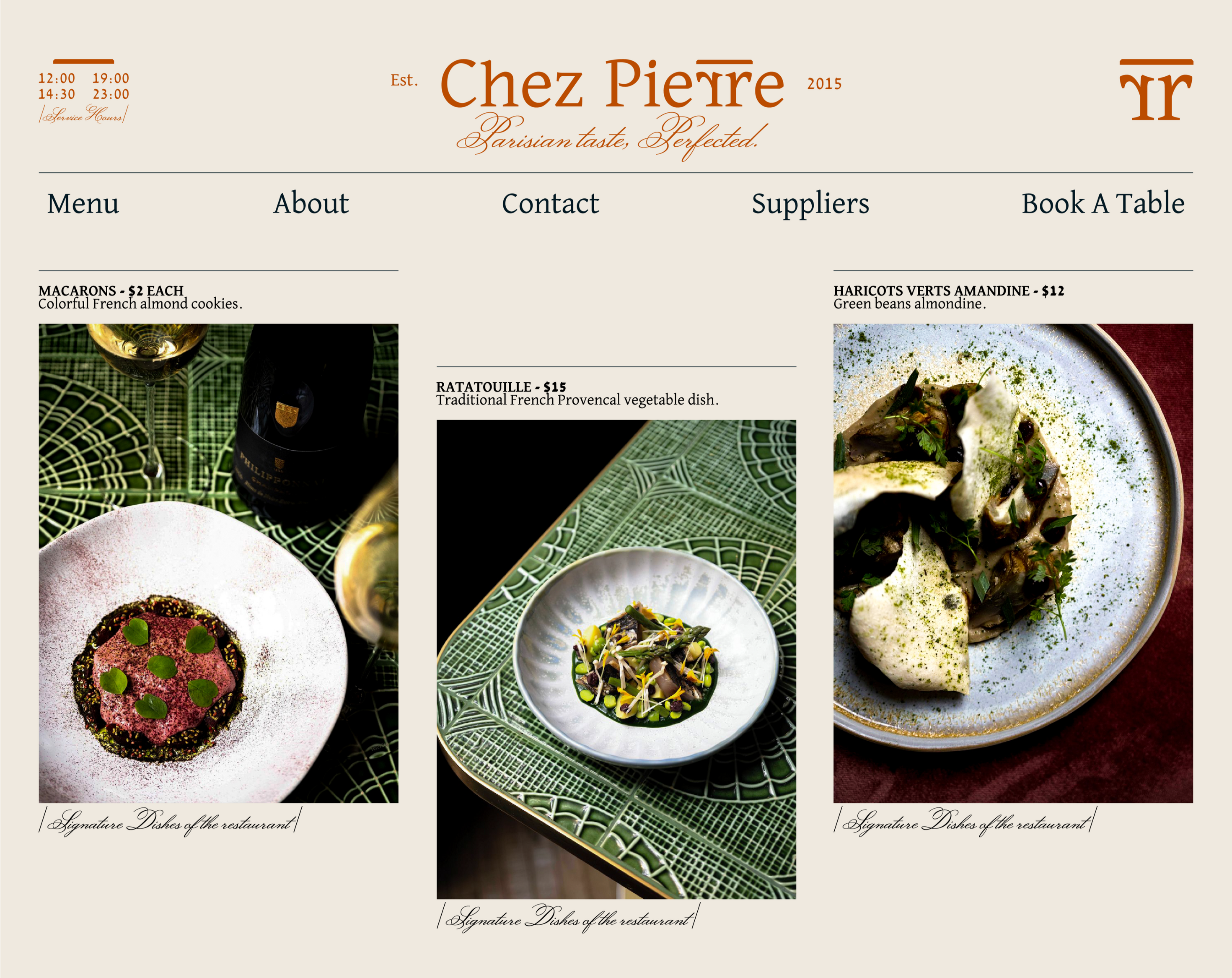 Chez Pierre is a French restaurant that captures the essence of Parisian flavor in an elegant and warm atmosphere. The brand identity highlights the diversity of French cuisine, showcasing unique regional flavors while offering an elevated dining experience. With the slogan "Parisian Taste, Perfected," Chez Pierre embodies the charm of French culture, delivering an authentic culinary journey for those who appreciate sophistication in French cuisine.