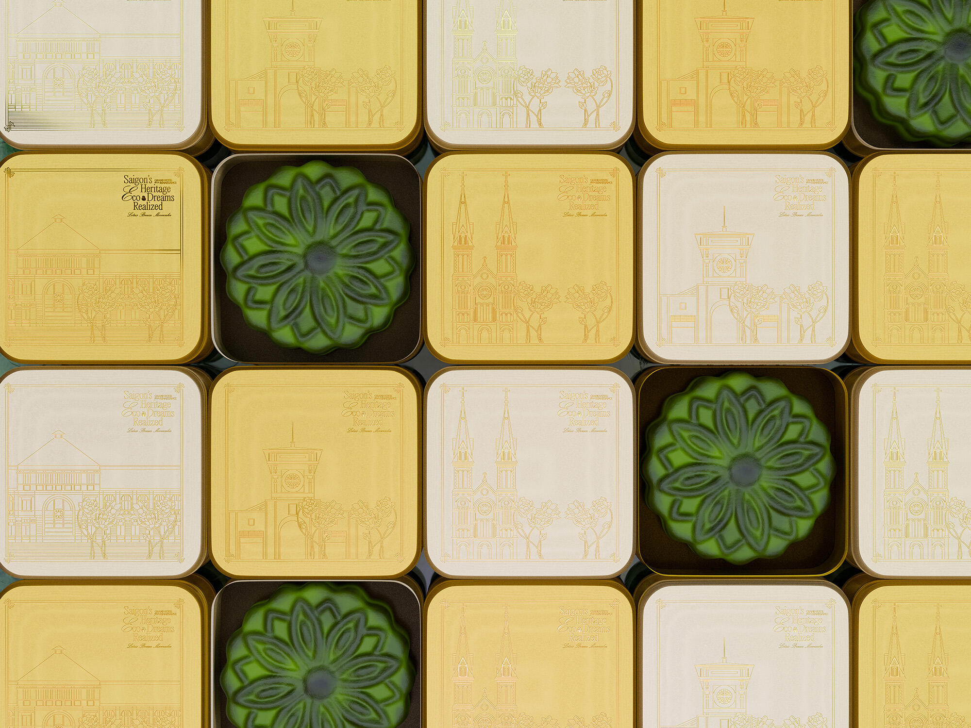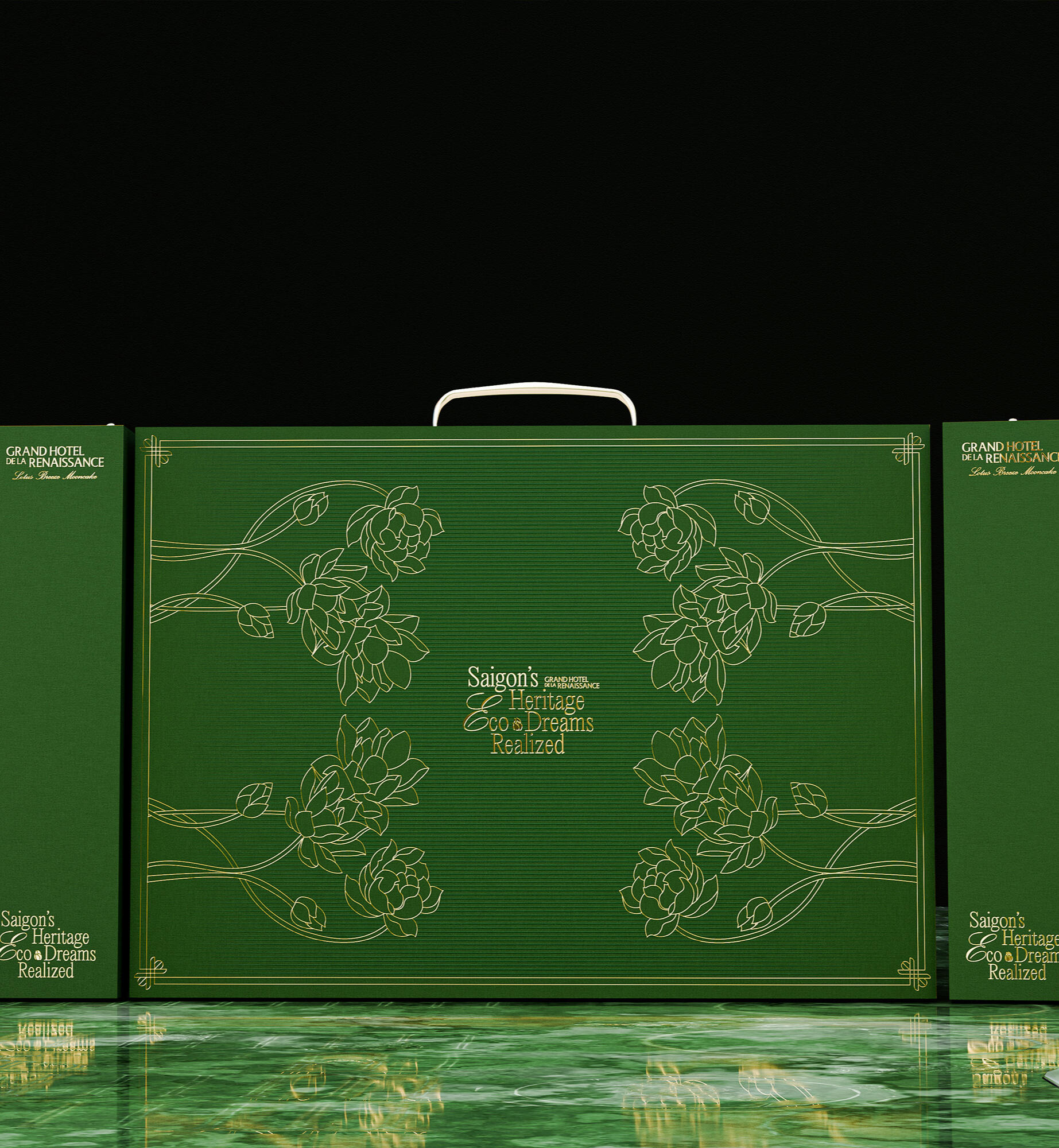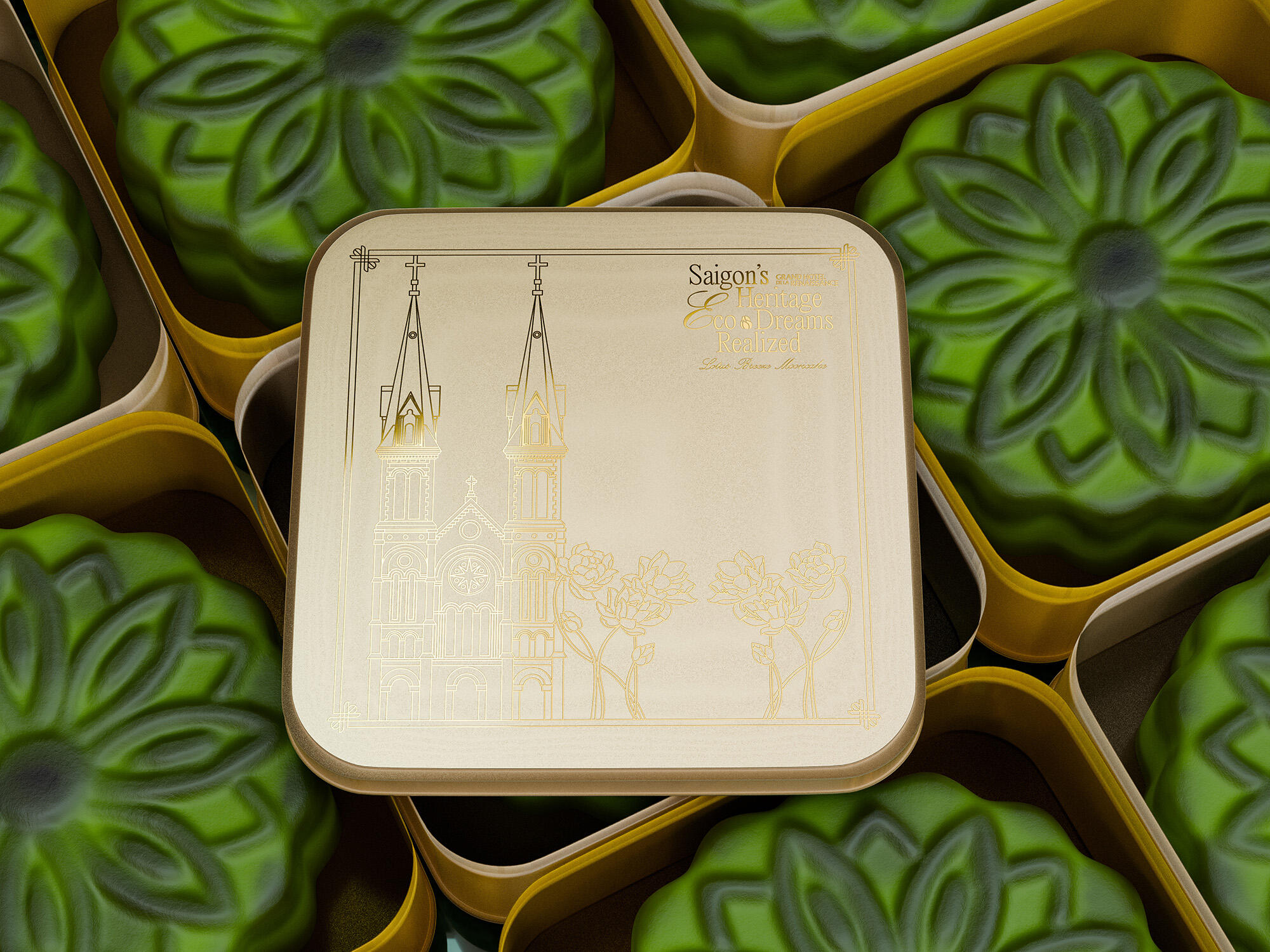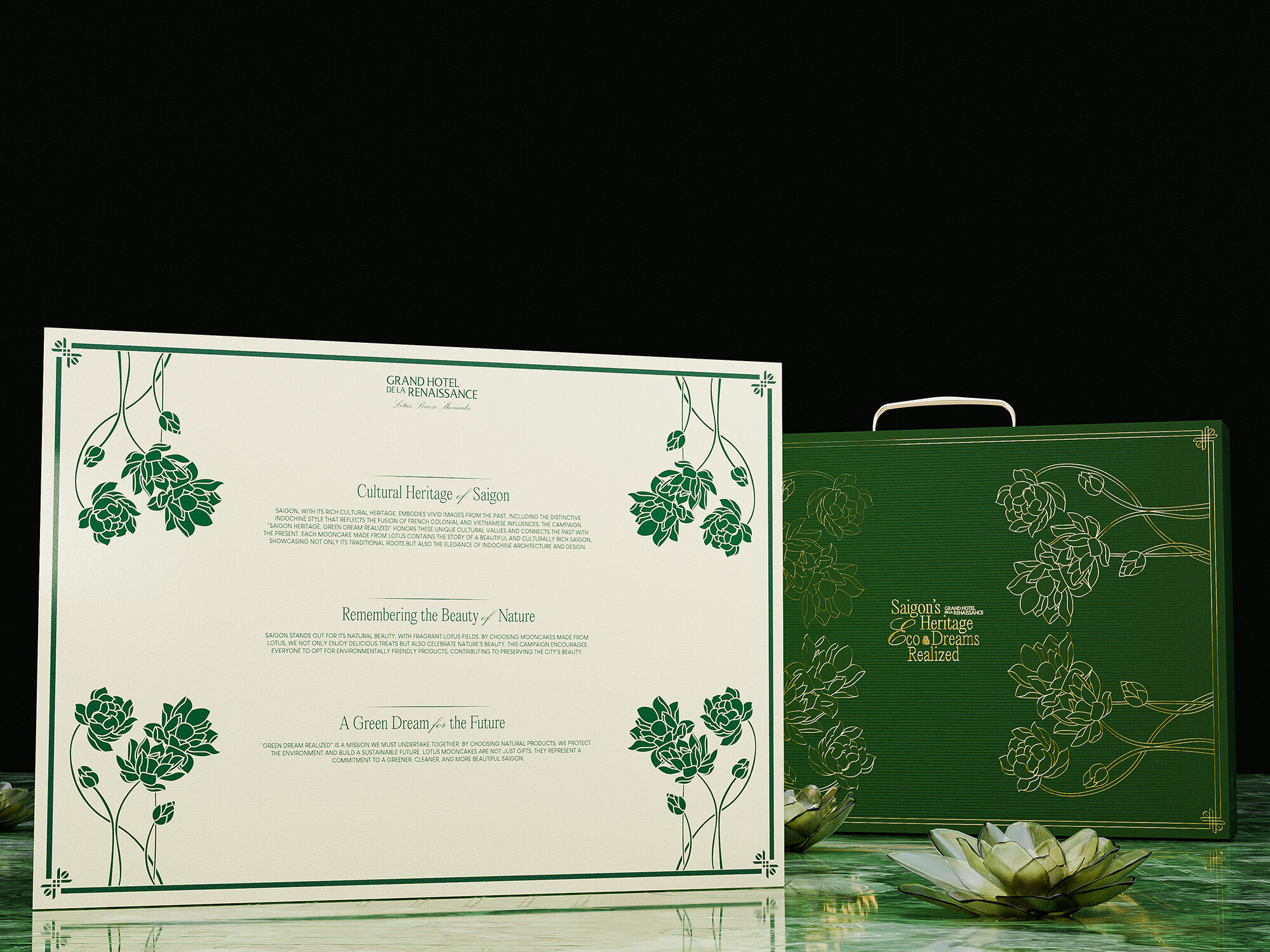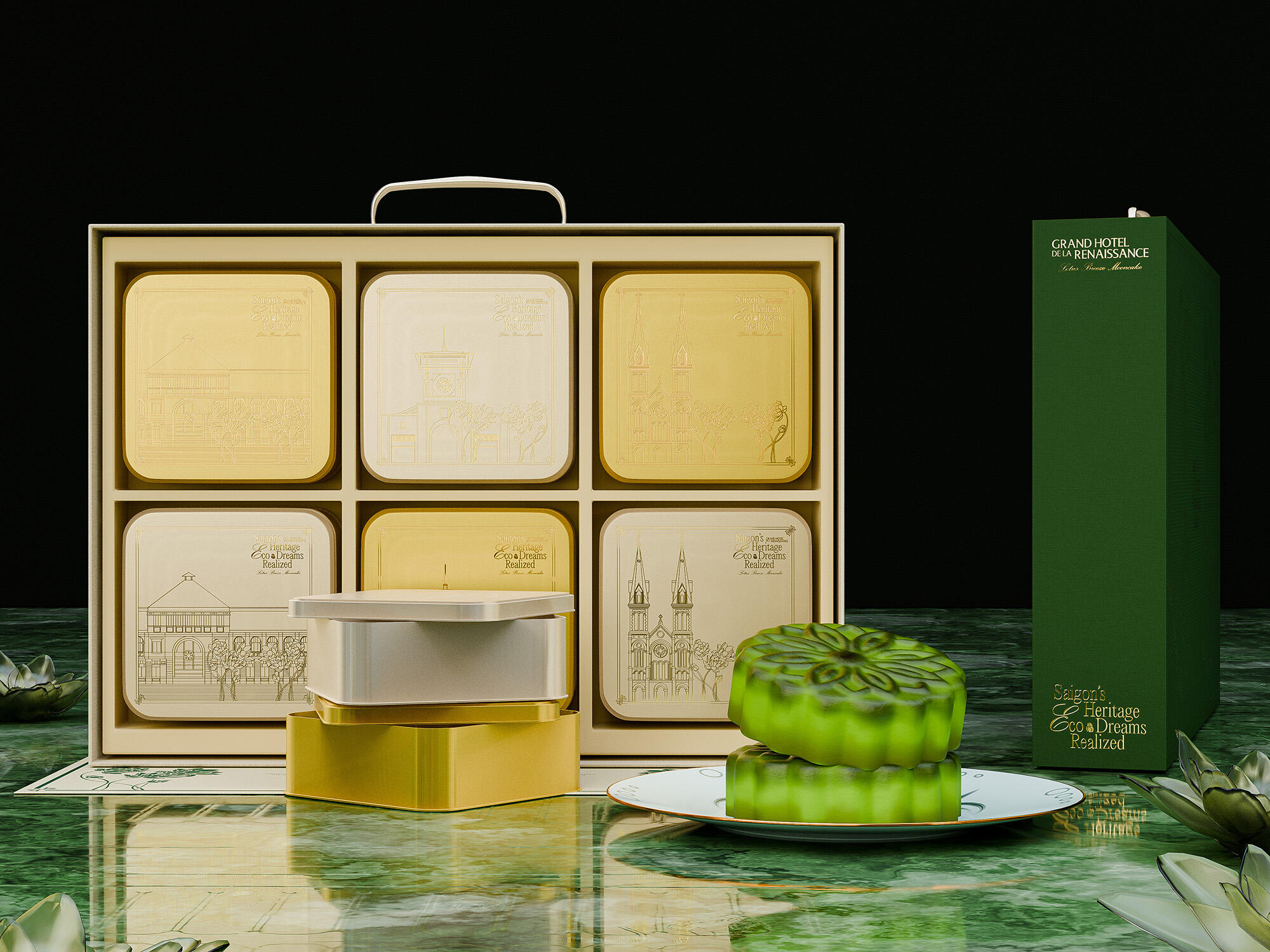 The "Lotus Breeze Mooncake" box from Grand Hotel de la Renaissance captures Saigon’s heritage and Indochine charm. Inspired by the golden era of Indochine, it blends classic French aesthetics with Vietnamese symbols. Featuring a lotus centerpiece that symbolizes purity, the packaging represents a fusion of tradition, artistry, and eco-friendly values, enriching each guest's experience of Saigon’s unique legacy.