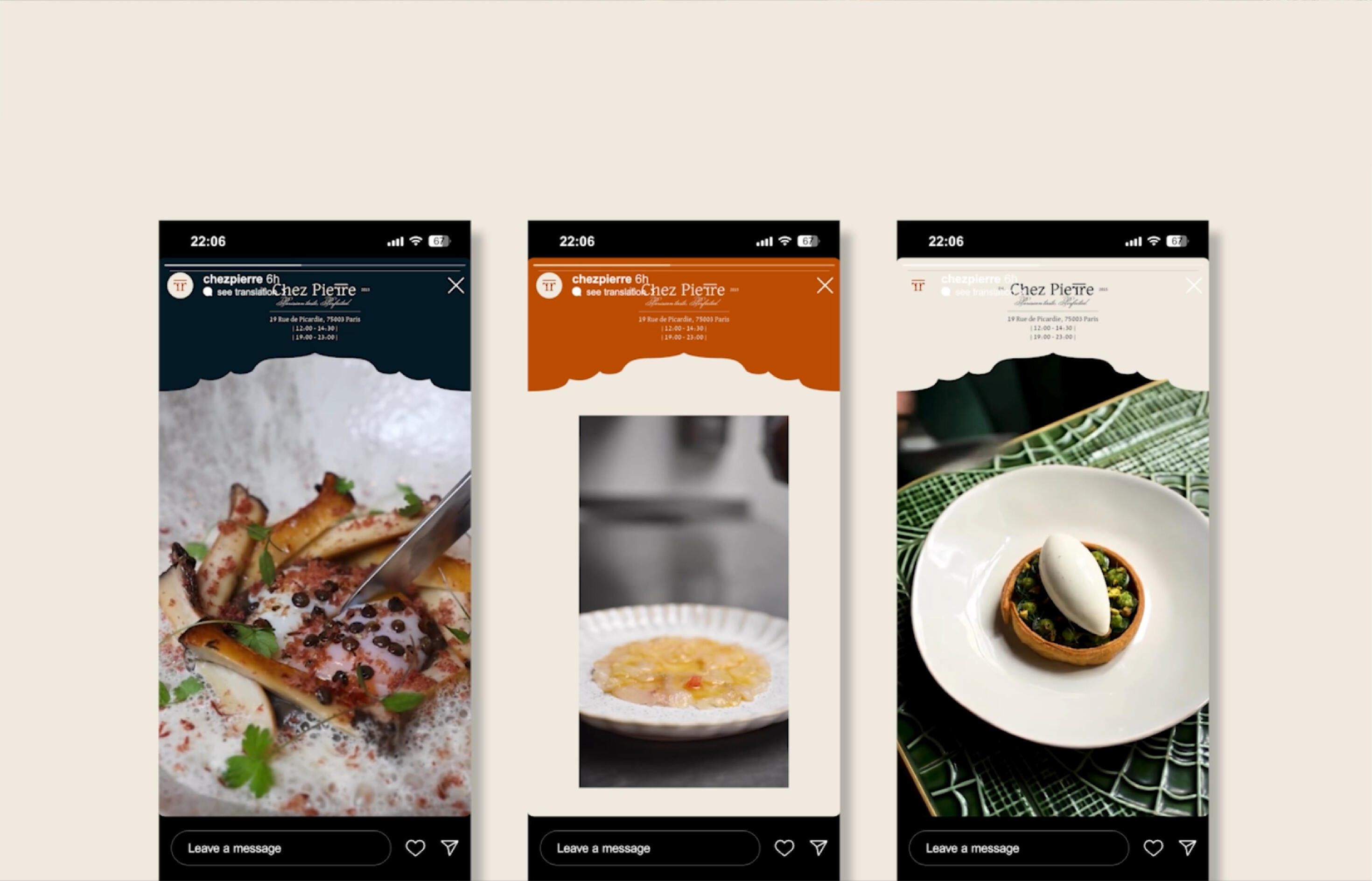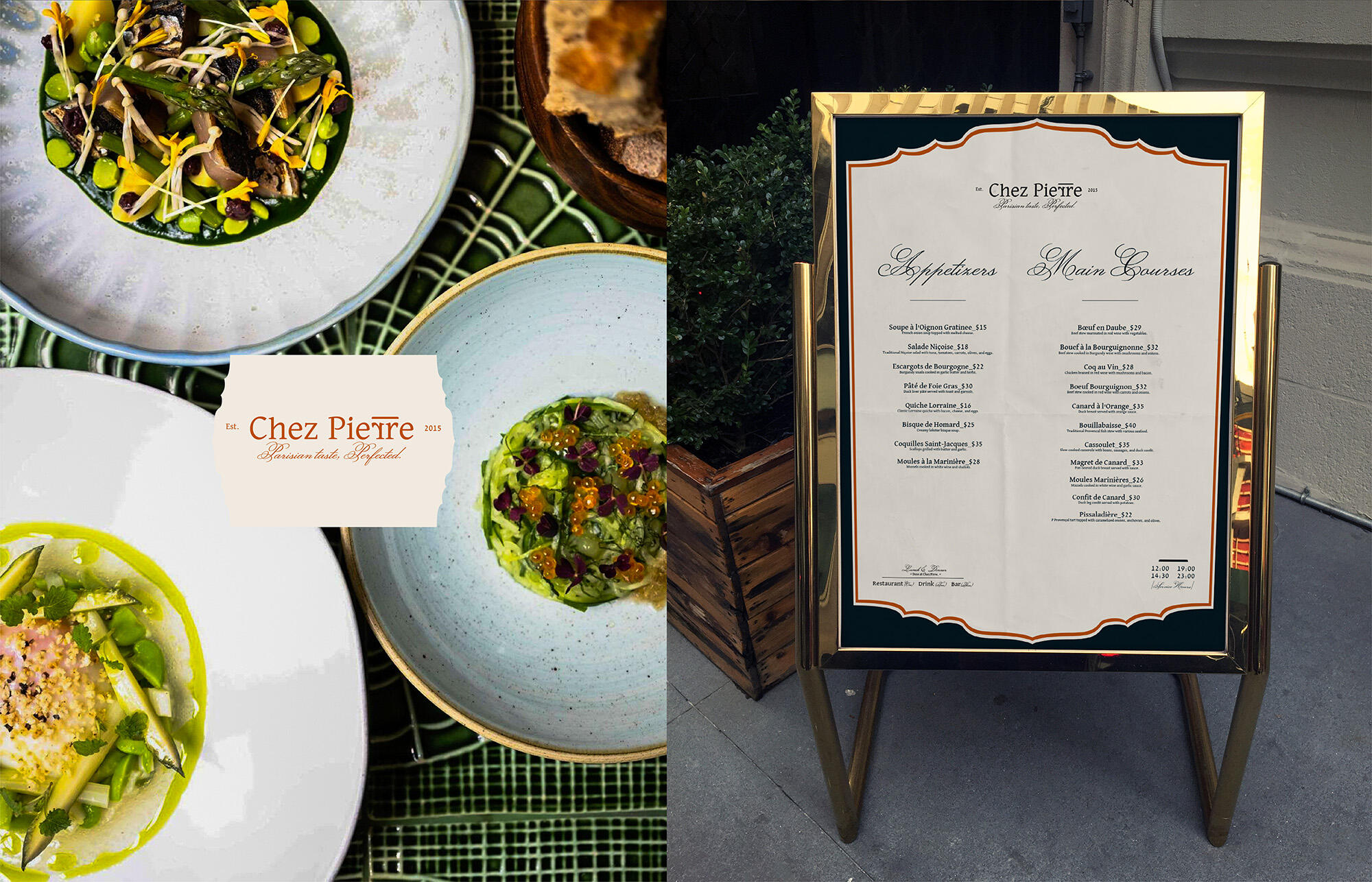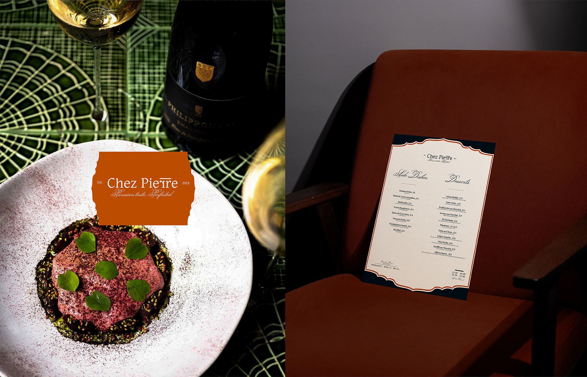 Chez Pierre is a French restaurant that captures the essence of Parisian flavor in an elegant and warm atmosphere. The brand identity highlights the diversity of French cuisine, showcasing unique regional flavors while offering an elevated dining experience. With the slogan "Parisian Taste, Perfected," Chez Pierre embodies the charm of French culture, delivering an authentic culinary journey for those who appreciate sophistication in French cuisine.